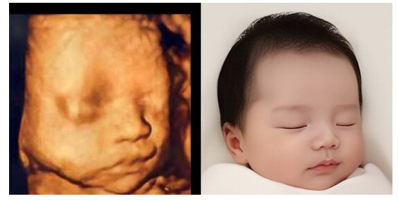 ![]() 이미지생성 AI프로그램으로 태아의 입체초음파 이미지<왼쪽>를 이용해 생후 50일 아기 모습<오른쪽>을 예측·제공한다. |