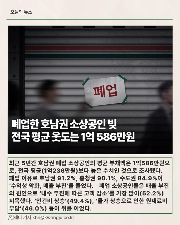 ✅폐업한 호남권 소상공인 빚, 전국 평균 웃도는 1억 586만원