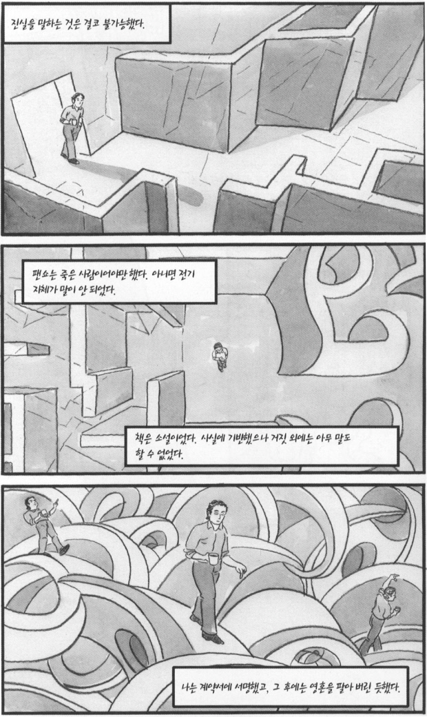 ‘뉴요커’ 등의 표지 작업에 참여한 이탈리아 작가 로렌초 마토티가 그림을 맡은 ‘유령들’은 화이트에게 고용돼 블랙이라는 이름의 남자를 쫓아다니며 지켜보는 일을 맡은 블루의 이야기를 담고 있다. 블랙만 보며 살아온 블루는 “전에는 한 번도 떠올린 적 없는 생각을 하고, 단순히 타인을 바라보는 것이 아니라 동시에 자기 자신도 바라보는 것만 같다”고 생각한다. 다른 두 편과 달리 텍스트의 분량이 많아 삽화가 그려진 소설을 읽는 기분이 드는 작품으로 짙은 음영과 그로테스크한 그림체가 인상적이다.