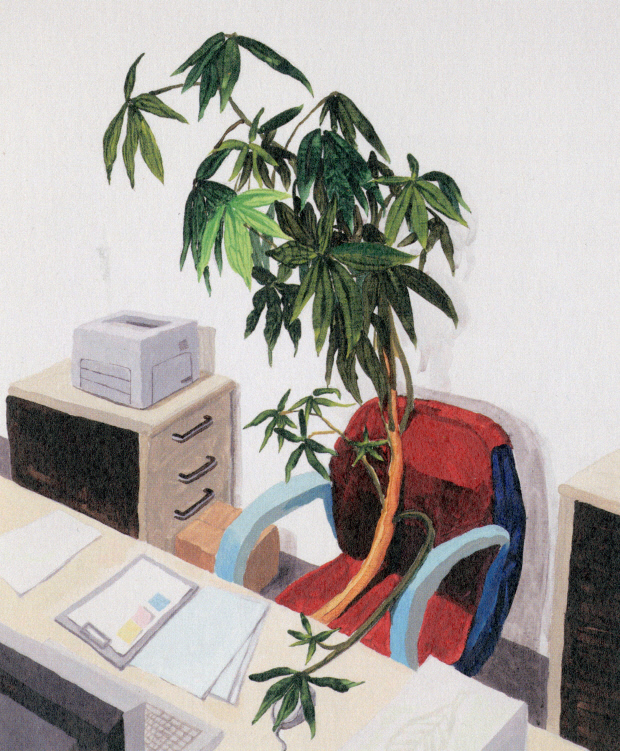 일이 많거나 급히 처리해야 할 경우에는 부득이하게 야근을 해야 했다. 일에 매달려 있는 동안 나무는 분위기를 따뜻하게 만들고 형광등 불빛으로 광합성을 해 소량의 산소를 만들어낸다. ‘야근’은 나무가 사람과 똑같이 사무용 의자에 앉아 근무를 하는 장면을 초점화했다. 사무용 의자에 앉아 가지를 뻗어 마우스를 잡고 있는 모습은 당시 일에 파묻혀 있던 작가의 모습을 대변한다.