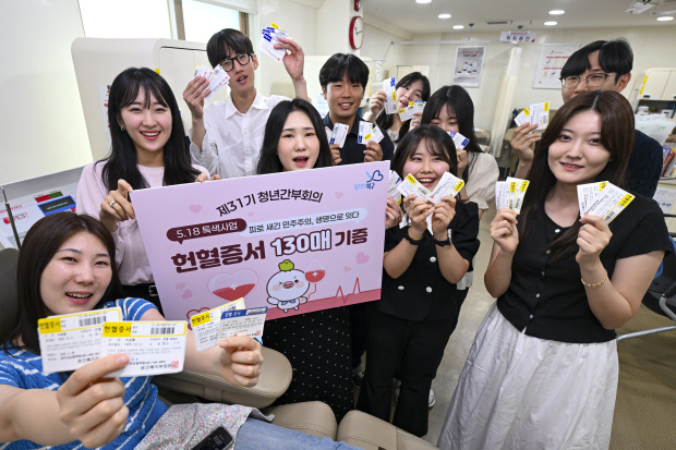 19일 광주 북구 헌혈의 집에서 북구청 청년간부회의가 5·18 민주화운동 45주년을 기념해 추진한 ‘민주주의, 생명으로 잇다’ 헌혈 캠페인을 통해 모은 헌혈증서를 들고 환호하고 있다.