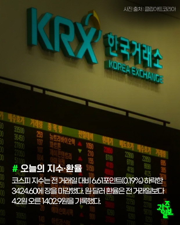 코스피 지수는 전 거래일 대비 6.61포인트(0.19%) 하락한 3424.60에 장을 마감했다. 원·달러 환율은 전 거래일보다 4.2원 오른 1402.9원을 기록했다.