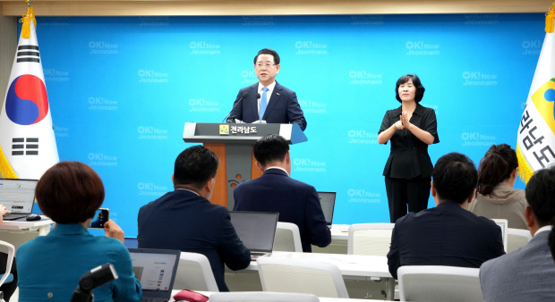 ![]() 김영록 전라남도지사가 2일 도청 브리핑룸에서 역사적인 오픈AI와 SK 합작 글로벌 AI 데이터센터 투자 환영문을 발표하고 있다. <전남도 제공> |
