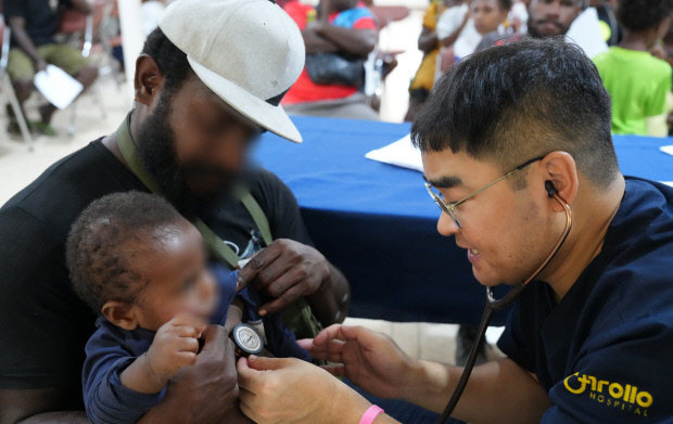![]() 성가롤로병원이 최근 태평양 섬나라 파푸아뉴기니에서 의료봉사를 펼쳤다. 소아청소년과 박병배 과장이 현지 어린이의 건강 상태를 진찰하고 있다. <성가롤로병원 제공> |