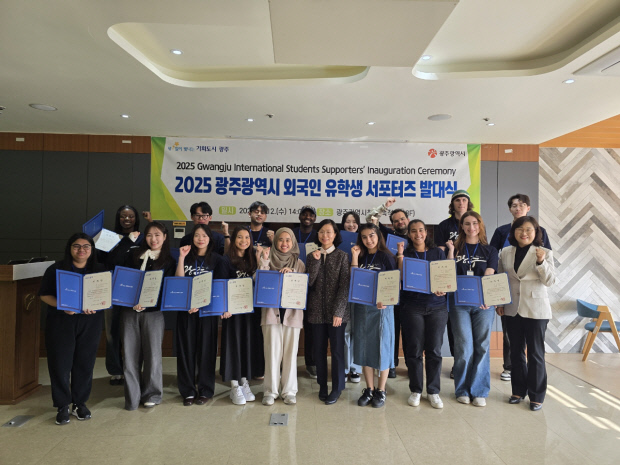 2025년도 신입 외국인 유학생 서포터즈가 지난달 24일 출범해 참석자 들이 기념촬영을 하고 있다. <광주시 제공>