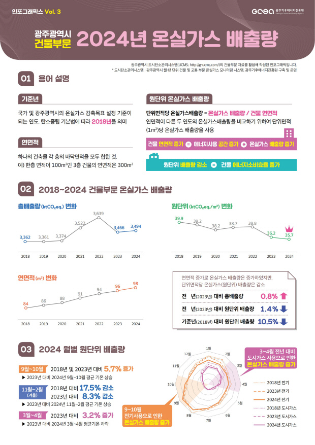 광주 건물부문 온실가스가 2024년 기준 전년도 보다 총량은 0.8% 늘었지만, 1㎡당 배출량(원단위)은 1.4% 줄어 35.7kgCO₂eq로 떨어졌다.