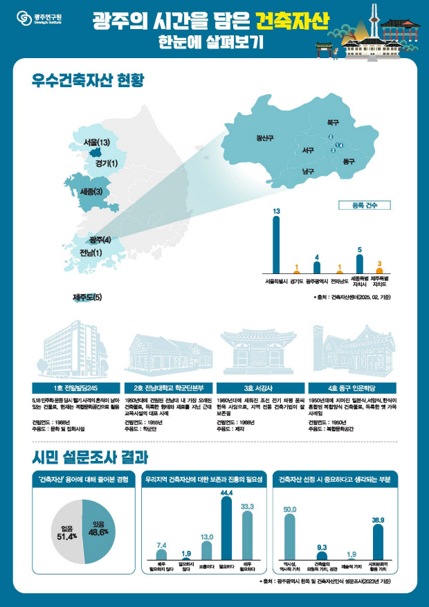광주연구원은 7일 ‘광주의 시간을 담은 건축자산’ 인포그래픽을 내고 총 534개 건축자산 현황을 공개했다.