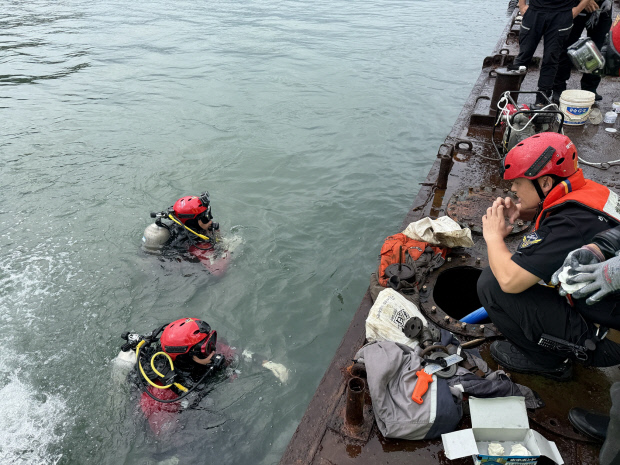 여수해경이 A호 파공부위를 확인하고 침수고 배출을 진행중이다.<여수해경 제공>