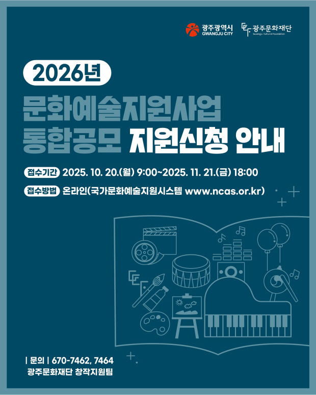 접수는 120일~11월 21일(오후 6시까지) 국가문화예술지원시스템(NCAS)을 통해 온라인으로 접수해야 하며 자세한 내용은 광주문화재단 홈페이지 참조.