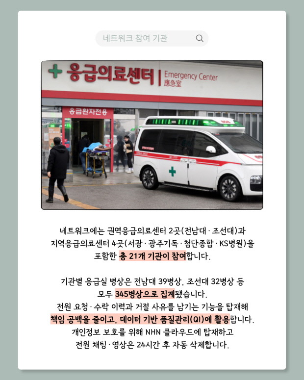 네트워크에는 권역응급의료센터 2곳(전남대·조선대)과 지역응급의료센터 4곳(서광·광주기독·첨단종합·KS병원)을 포함한 총 21개 기관이 참여합니다.