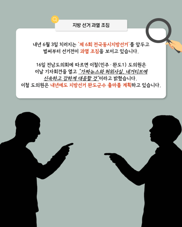 16일 전남도의회에 따르면 이철(더불어민주당·완도1) 도의원은 이날 기자회견을 열고 “가짜뉴스와 허위사실, 네거티브 공세에 신속하고 강하게 대응하겠다”고 밝혔습니다.