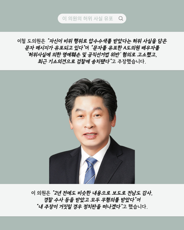 이 도의원은 내년 지방선거에서 완도군수 출마를 준비 중인데, “비위 행위로 압수수색을 받았다는 허위 내용의 문자 메시지가 유포되고 있다”며 “문자를 유포한 A도의원 배우자를 ‘허위사실에 의한 명예훼손 및 공직선거법 위반’ 혐의로 고소했고, 최근 기소 의견으로 검찰에 송치됐다”고 주장했습니다.