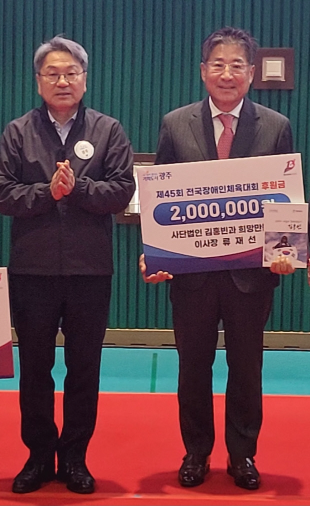 이날 광주시장애인국민체육센터에서 열린 ‘제45회 전국장애인체육대회 광주선수단 결단식’에서 류재선 이사장은 광주시장애인체육회 회장인 강기정 시장에게 후원금을 전달했다. 후원금은 광주시 선수단의 사기 진작과 장애 학생 체육 선수 발굴 및 육성 등에 쓰이게 된다.