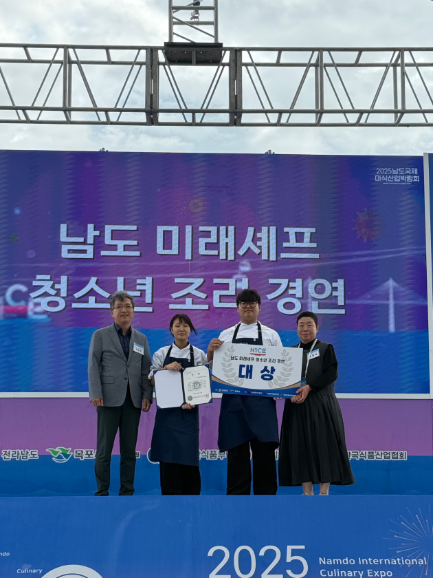 ![]() 지난 15일 열린 ‘남도미래 셰프 청소년 조리경연’에서 대상을 수상한 순천효산고 이하연(왼쪽에서 두번째), 이동현 학생. <이하연양 제공> |