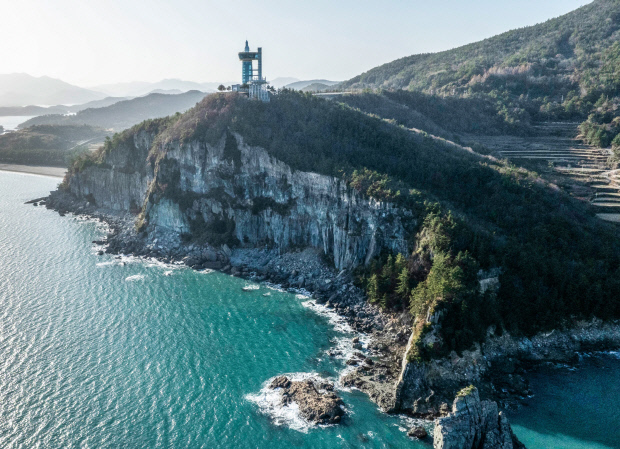 하늘에서 바라 본 우주발사전망대가 발사대에 기립한 듯 위풍당당한 자태를 뽐내고 있다. /최현배 기자