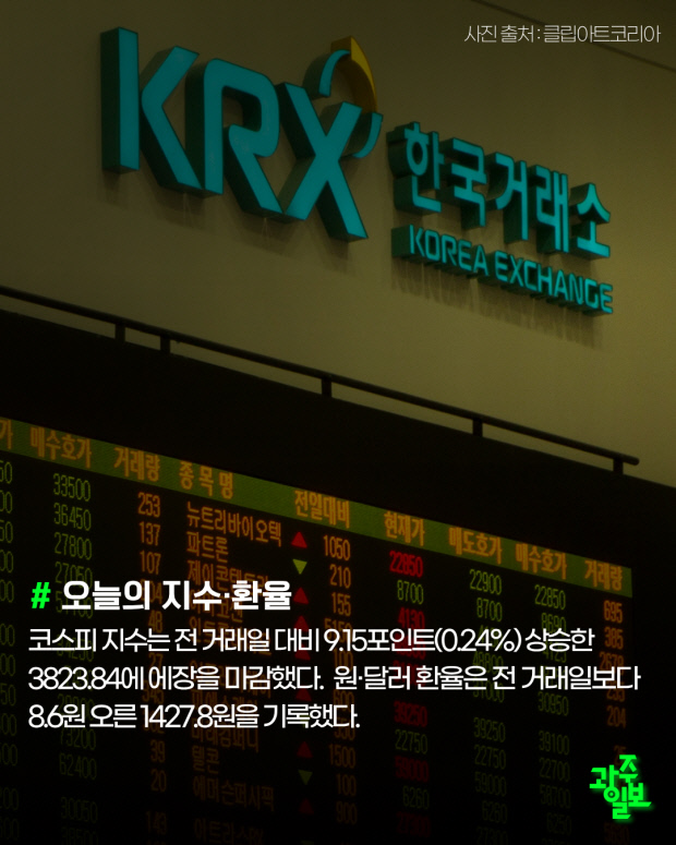 코스피 지수는 전 거래일 대비 9.15포인트(0.24%) 상승한3823.84에 에장을 마감했다. 원·달러 환율은 전 거래일보다 8.6원 오른 1427.8원을 기록했다.