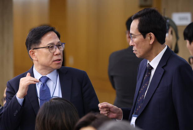 ![]() 우상호(오른쪽) 정무수석이 임웅순 국가안보실 제2차장과 23일 서울 용산 대통령실에서 열린 수석보좌관회의에서 대화하고 있다. /연합뉴스 |