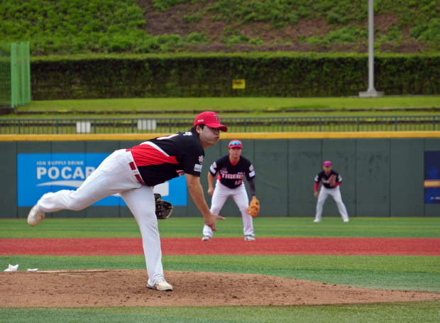 KIA 황동하가 고양과의 경기 선발로 나와 공을 던지고 있다. |