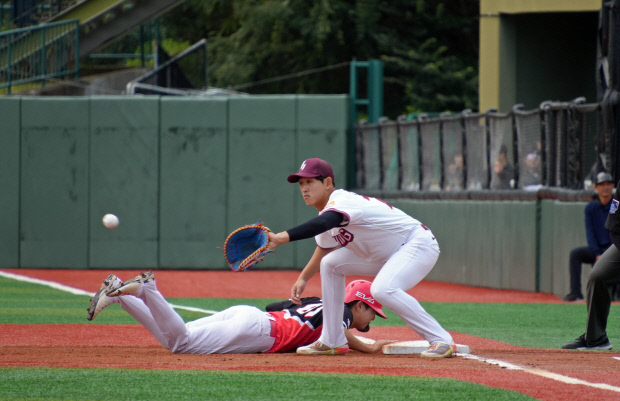 황동화가 1회말 고양 염승원의 1루 땅볼 때 박상준에게 공을 넘겨 받기 위해 베이스 커버를 들어가고 있다. |