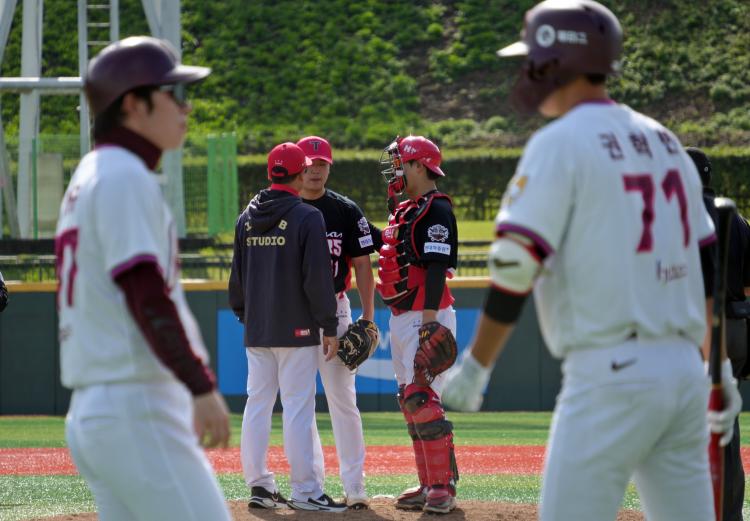 3-2로 앞서 6회초 황동하가 무사 2루에서 볼넷을 허용하자 정재훈 투수코치가 마운드를 방문했다. |