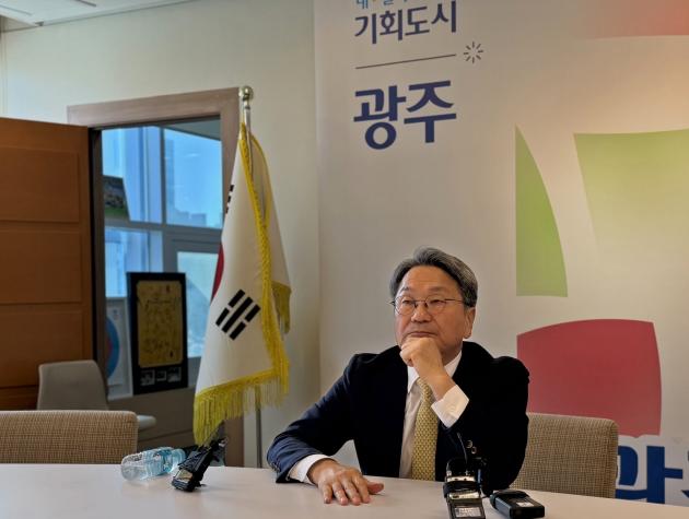 ![]() 27일 강기정 광주시장이 김용범 대통령실 정책실장을 만난뒤 시장실에서 백브리핑을 진행하고 있다. |
