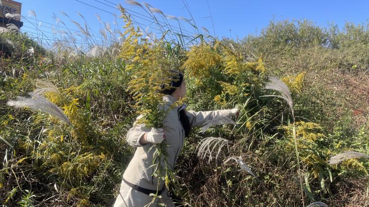 2009년 생태계 교란 생물로 지정된 양미역취는 미국과 캐나다 인접지역이 원산지로, 줄기 전체에 털이 있으며 성인 키를 훌쩍 넘어 자라나 가을천 하천이나 도로변에 노란 꽃을 피우는 것이 특징이다.