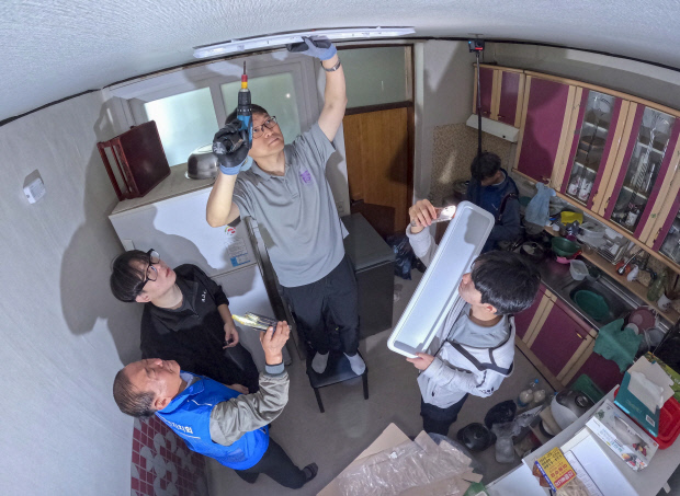 광주 북구 운암2동 주민자치회 위원들과 금파공업고등학교 학생들이 27일 오전 관내 한 가정에서 ‘학생과 함께하는 건강하고 안전한 운암2동 만들기’ 사업의 일환으로 낡은 실내등을 LED 전등으로 교체, 설치하고 있다. /김진수 기자 jeans@kwangju.co.kr