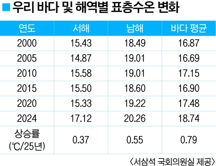 남해바다는 더 뜨거워졌다. 25년 전인 2000년 남해바다 표층 수온은 18.49도. 지난 2023년(19.92도)까지 18~19도를 오르내리더니 지난해 20도(20.26도)를 넘어섰고 올해도 0.55도 상승한 것으로 조사됐다.