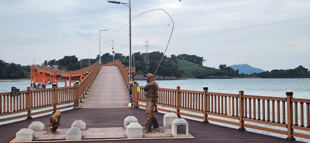 ![]() 여자도 해안 데크길에서 연도교로 연결된 송여자도 전경. 여자도는 대여자도, 송여자도는 소여자도로도 불린다. 연도교 입구에 설치된 낚싯꾼 조각상. |