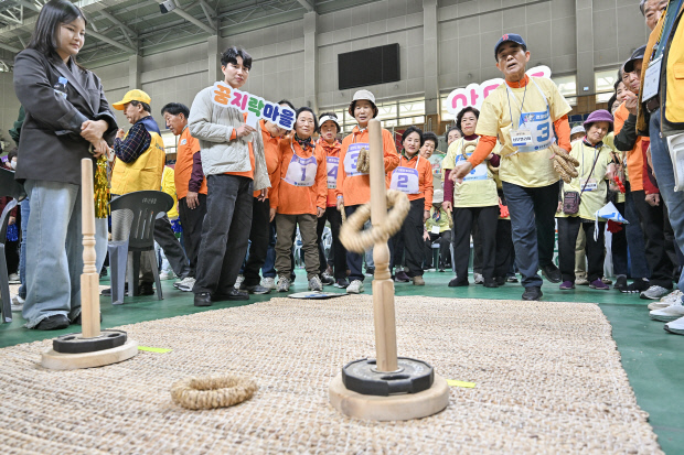 ![]() 28일 광주시 서구 빛고을체육관에서 열린 ‘제9회 경로당 놀이대회’가 성황리에 막을 내렸다. 고리 던지기 경기 모습. <광주시 서구 제공> |