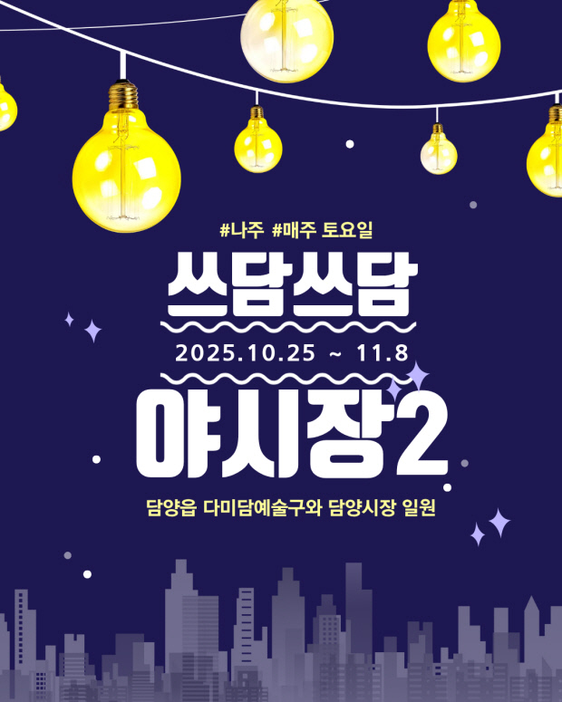 담양군이 11월 8일까지 담양읍 다미담예술구와 담양시장 일원에서 매주 토요일마다 ‘쓰담쓰담 야시장 시즌2’를 연다. 이번 야시장은 지역 가수들의 버스킹, 즉석 사연 노래방 등의 흥겨운 무대와 다채로운 먹거리를 담은 푸드 트럭이 준비돼 있다. 또한 군은 야시장 기간동안 지역 소비 촉진과 상권 활성화를 위해 현장 결제 고객을 대상으로 일정 금액을 담양사랑상품권으로 되돌려주는 ‘페이백 이벤트’를 진행한다. 아울러 야시장 기간 동안 열리는 벼룩시장에선 지역 상인과 청년 창업가들이 참여해 수공예품, 생활소품 등 개성 있는 상품을 선보일 예정이다.