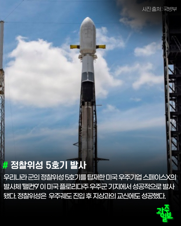 우리나라 군의 정찰위성 5호기를 탑재한 미국 우주기업 스페이스X의 발사체 ‘팰컨9’이 미국 플로리다주 우주군 기지에서 성공적으로 발사됐다. 정찰위성은 우주궤도 진입 후 지상과의 교신에도 성공했다.