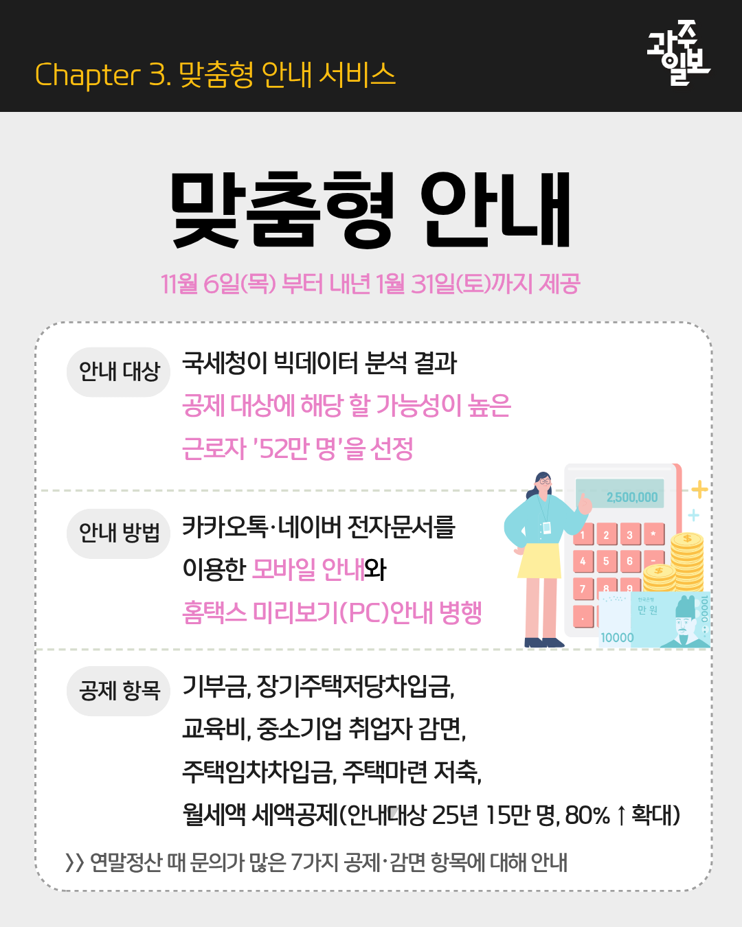 또 중소기업 취업자 감면, 월세액 공제 등 문의가 많은 7개 공제·감면 항목에 해당할 가능성이 높은 이들에게 카카오톡이나 네이버 전자문서 등으로 안내를 발송해 적용요건과 필요한 증빙서류를 확인할 수 있도록 하고 있다.