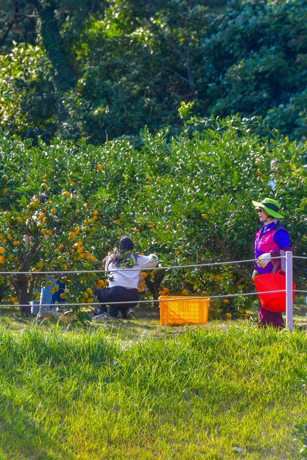 과원에 들어서자 주황빛 감귤들이 햇살을 받아 반짝인다. 안내를 맡은 직원의 설명에 따라 손을 뻗어 감귤을 따자 손끝에 전해지는 묵직한 감귤의 느낌과 상큼한 향기가 동시에 전해진다.