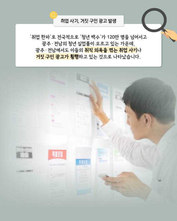 전국적으로 ‘청년 백수’가 120만 명을 넘어서고 청년 실업률이 오르고 있는 가운데, 광주·전남에서도 이들의 취직 의욕을 꺾는 취업 사기나 거짓 구인 광고가 증가하고 있습니다.