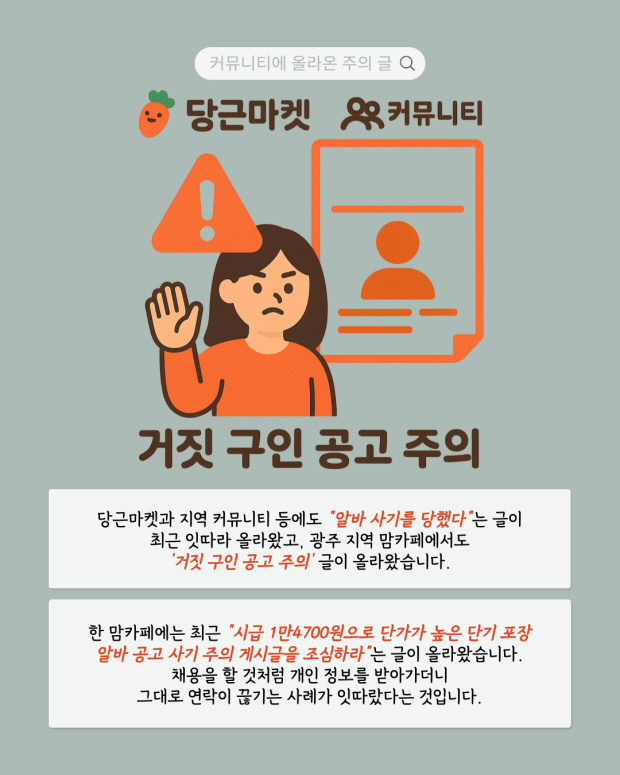 당근마켓과 지역 커뮤니티 등에도 “알바 사기를 당했다”는 글이 최근 잇따라 올라왔고, 한 맘카페에는 최근 “시급 1만4700원으로 단가가 높은 단기 포장 알바 공고 사기 주의 게시글을 조심하라”는 글이 올라왔습니다. 채용을 할 것처럼 개인 정보를 받아가더니 그대로 연락이 끊기는 사례가 잇따랐다는 것입니다.