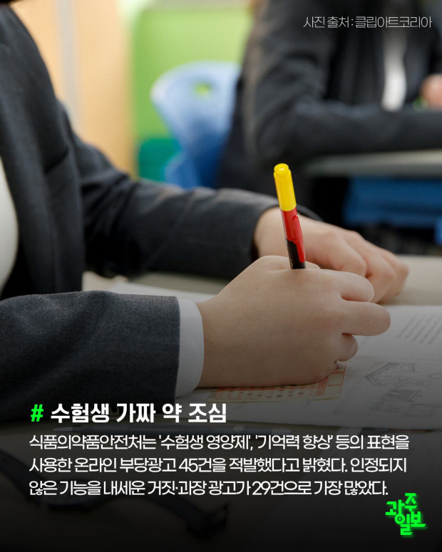 식품의약품안전처는 ‘수험생 영양제’, ‘기억력 향상’ 등의 표현을 사용한 온라인 부당광고 45건을 적발했다고 밝혔다. 인정되지 않은 기능을 내세운 거짓·과장 광고가 29건으로 가장 많았다.