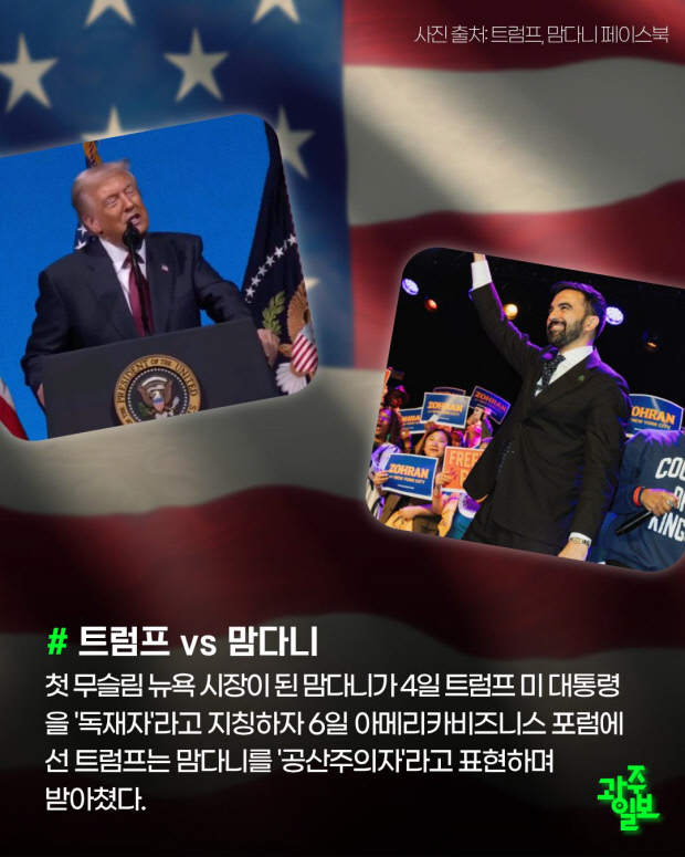 첫 무슬림 뉴욕 시장이 된 맘다니가 4일 트럼프 미 대통령을 ‘독재자’라고 지칭하자 6일 아메리카비즈니스 포럼에 선 트럼프는 맘다니를 ‘공산주의자’라고 표현하며 받아쳤다.