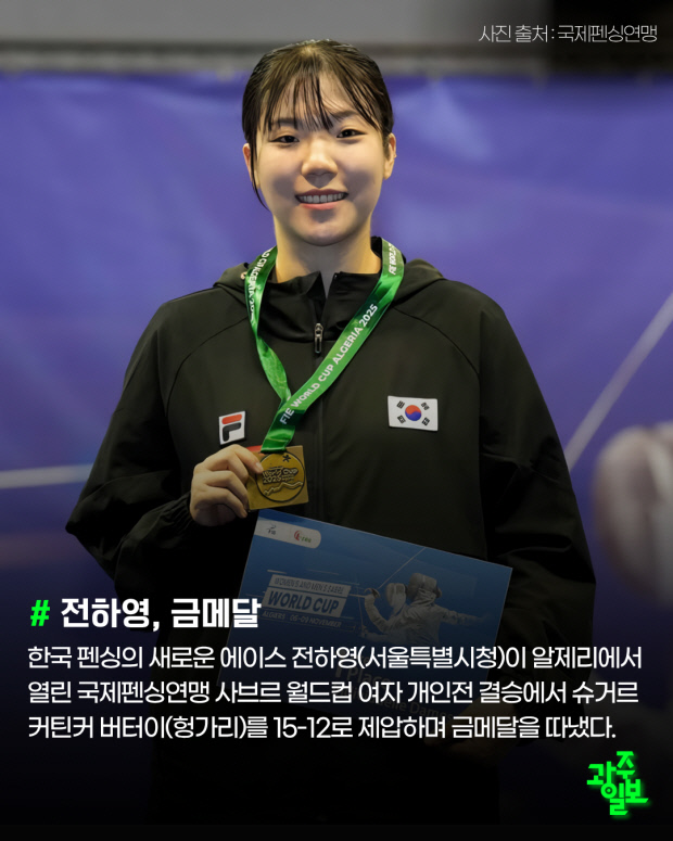 한국 펜싱의 새로운 에이스 전하영(서울특별시청)이 알제리에서 열린 국제펜싱연맹 사브르 월드컵 여자 개인전 결승에서 슈거르 커틴커 버터이(헝가리)를 15-12로 제압하며 금메달을 따냈다.