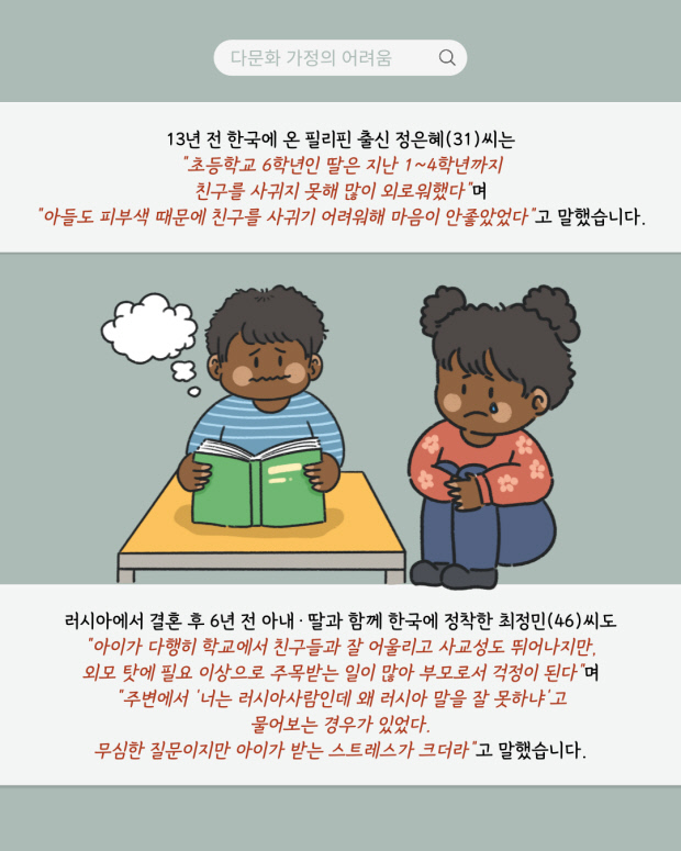이주배경 학생의 자퇴 사유로는 ‘학교 부적응’이 가장 많았습니다. 문제는 가정통신문이나 교과서 등이 온통 한국어로 돼 있는 등 다문화 학부모를 위한 교육·행정체계의 배려가 없다 보니 학부모들이 자녀 교육에 도움을 주기 힘든 구조가 만들어진다는 점입니다.