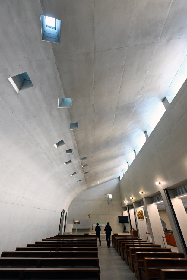◇‘녹는 소금’의 상징, 빛으로 빚은 공간= 명례성지 새 성당, 일명 ‘소금 성전’의 건축 언어를 이해하는 핵심 열쇠는 ‘녹는 소금’이다. 이는 순교자 신석복 마르코의 삶 그 자체에서 가져온 상징이다. 그는 ‘누룩과 소금 행상’을 하던 소금 장수였다. 스스로를 녹여 맛을 내고 부패를 막는 소금처럼, 그는 자신의 목숨을 바쳐 신앙을 증거했다. 건축가는 이 ‘녹는 소금’이라는 순교의 형상을 ‘빛’으로 치환했다. 성당 지붕이자 야외 제단 광장 바닥에는, 마치 소금 결정을 흩뿌려 놓은 듯한 12개의 사각 조형물이 솟아있다. 이는 12사도를 상징하는 동시에, 성전 내부로 빛을 끌어들이는 천창이다. 육중한 문을 밀고 성전 안으로 들어서는 순간, 방문객은 완전한 어둠과 마주한다. 인공조명을 극도로 절제한 공간, 스테인드글라스 하나 없는 거친 콘크리트 벽 속에서, 시선은 천창에서 스며든 빛줄기들에 집중된다.
