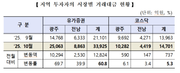![]() 2025년 10월 광주·전남 지역 투자자 거래대금 현황 표.<한국거래소 광주혁신성장센터 제공> |