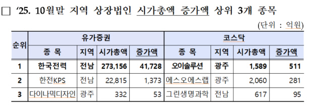 10월 말 기준 지역 상장사 시총을 보면 한전이 27조 3156억원으로 4조 1728억원 올라 가장 큰 상승폭을 보였다. 이어 한전KPS(1373억원), 오이솔루션(1589억원), 에스오에스랩(281억원), 그린생명과학(95억원) 등도 순으로 시총 증가액이 컸다.