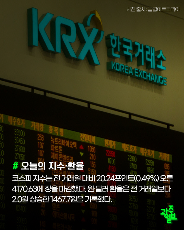코스피 지수는 전 거래일 대비 20.24포인트(0.49%) 오른 4170.63에 장을 마감했다. 원·달러 환율은 전 거래일보다 2.0원 상승한 1467.7원을 기록했다.