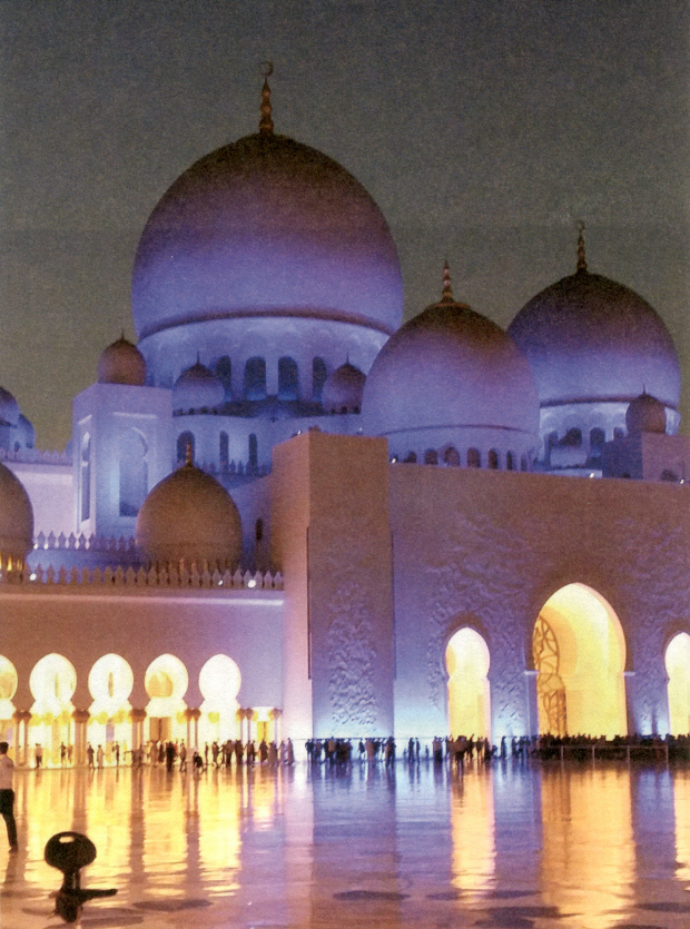![]() 푸른 조명 아래 돔과 황금빛으로 물든 모스크 |