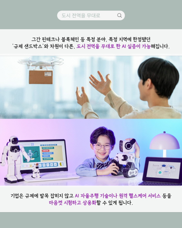 그간 핀테크나 블록체인 등 특정 분야, 특정 지역 에 한정됐던 ‘규제 샌드박스’와 차원이 다른, 도시 전역을 무대로 한 AI 실증이 가능해집니다.