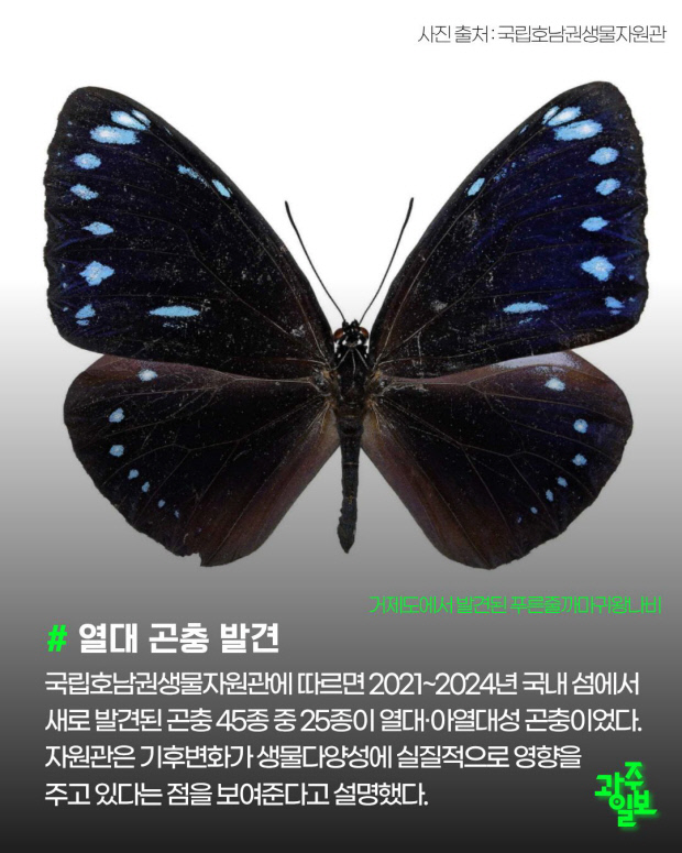 국립호남권생물자원관에 따르면 2021~2024년 국내 섬에서 새로 발견된 곤충 45종 중 25종이 열대·아열대성 곤충이었다. 자원관은 기후변화가 생물다양성에 실질적으로 영향을 주고 있다는 점을 보여준다고 설명했다.