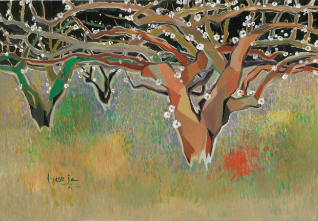 ‘나주의 금천 배꽃 A’는 어느 봄날, 배꽃이 천지인 과수원의 풍경을 초점화한 작품이다. 하늘이 보이지 않을 만큼 하얗게 뒤덮인 배꽃은 점점이 떠 있는 하얀 등을 연상시킨다. 배나무 아래 녹색의 풀밭은 배꽃의 흰색과 절묘한 보색의 대비로 환상적 이미지를 환기한다.