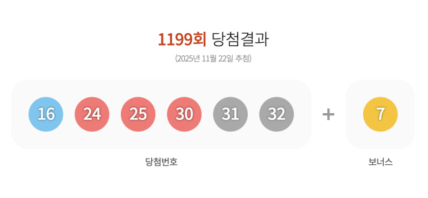 22일 진행된 제1199회 동행복권 추첨에서 ‘16, 24, 25, 30, 31, 32’가 1등 당첨 번호가 됐다.