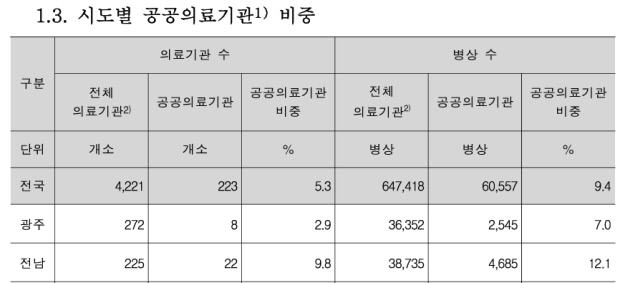 23일 국립중앙의료원 ‘2024년 공공의료기관 현황’에 따르면 지난해 병원급 이상 공공의료기관 223곳 가운데 광주 기관은 8곳, 전남은 22곳으로 집계됐다. 지역 전체 의료기관 중 공공기관이 차지하는 비중은 광주 2.9%(272곳 중 8곳), 전남 9.8%(225곳 중 22곳)로 나타났다.